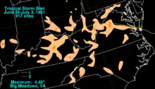 In Virginia, Bret produced relatively light rainfall, peaking at 4.48 inches (114 mm) in Big Meadows, a section of Shenandoah National Park.[4] At the time of Bret's landfall, portions of the Mid-Atlantic states were experiencing a strong drought, though the amounts of precipitation were not enough for farmers in Virginia to save their crops.[11] In Virginia Beach, local street flooding and a brief tornado were reported.[12] Minor beach erosion occurred in the area due to tides reaching about 0.9 feet (0.27 m) above normal.[13] One fatality was confirmed in North Carolina when a woman was killed after getting stuck in rip currents at Nags Head. Offshore, two boats lost contact with the Coast Guard during the approach to land, one of which washed up at Cape May, New Jersey and the other on the Virginia coast.[14] The Coast Guard began cleanup of an oil spill at Nags Head caused by Bret off the coast. About 8 miles (13 km) of the shoreline was filled with oil, little of which polluted the water. Most of the oil was thin and easily cleanup private contractor.[15] Locally heavy rainfall in western Pennsylvania flooded streets and basements in some areas, with up to 4 inches (100 mm) of precipitation in Brookville.[16] Elsewhere, Bret dropped 1 to 3 inches (25 to 76 mm) of precipitation in several states.[17] Overall, no considerable damage was reported.[1]