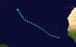 A tropical wave exited the coast of Africa on September 16 with copious convection. It tracked westward, developing into Tropical Depression Twelve on September 21 while located a few hundred miles west of Cape Verde. Without intensifying further, the depression turned northward, due to a weakness caused by the deepening of a 200 mbar cut-off low near the Iberian Peninsula. Under the influence of a building high pressure area, the depression turned to a northwest and later westward drift. It into Tropical Storm Josephine on September 24, although increased wind shear from a trough weakened the storm back to a tropical depression on September 26. It remained weak for several days, gradually turning to the north due to a weak trough over the northwestern Atlantic. On October 1, another high pressure area halted its northward movement, causing Josephine to turn to the east. That day, it re-intensified into a tropical storm as it began to execute a small cyclonic loop. An approaching trough caused Josephine to accelerate north-northeastward, and with favorable conditions it intensified into a hurricane on October 5, after existing nearly two weeks.[45][46]
