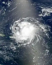 Forecasters initially predicted wind shear from an upper-level low would prevent strengthening and cause dissipation within three days.[2] However, the depression continued to organize as deep convection continued to develop near the circulation despite moderate amounts of wind shear, and the system intensified into Tropical Storm Chris six hours after developing.[1][3] The convection gradually consolidated over the system, and by late on the 1st Chris reached winds of 60 mph (97 km/h) while passing 50 miles (80 km) north of the northern Leeward Islands.[4] The structure of Chris continued to improve and become more symmetrical, and an upper level eye feature developed early on August 2. Outflow improved in all quadrants, as well,[5] and the storm reached a peak intensity of 65 mph (105 km/h) shortly thereafter while located 120 miles (190 km) east of St. Thomas. Despite initial predictions of Chris intensifying to a hurricane as a ridge of high pressure forced it west-northwestward,[6] upper-level shear dissipated the well-defined inner core of the storm, and Chris started to weaken.[7]