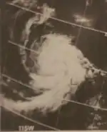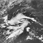 Like Claudia before it, Doreen's formation (which started as a large cloud mass on the ITCZ) went mostly unmonitored by ship because of a lack of shipping.[2] On August 4, a relatively unusual cirrus cloud formation resembling a pinwheel formed over the center of the storm. The formation had provided efficient evidence that the system had developed into a tropical storm, bypassing the depression stage.[1][2] Doreen continued a northwest track, deepening along the way, and on August 5, a ship reported 70 mph (115 km/h) winds with a 993 mb pressure near the storm center. Based on this, Doreen was upgraded to a hurricane, the second of the season.