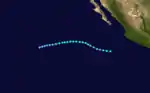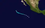 On June 4, a tropical depression formed 585 miles (945 km) southwest of Acapulco, Mexico Early the next day, the depression system intensified into the first tropical storm of the season and was named Victoria. At that time, the storm was at its peak intensity of 50 mph (85 km/h) which it retained while moving the northwest. Early on June 7, the tropical storm weakened into a tropical depression before dissipating six hours later. [1] In all, Tropical Storm Victoria stayed at sea.