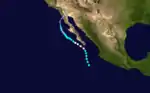 During the afternoon of August 7, a tropical depression formed 150 miles southwest of Cabo San Lucas, Mexico. On August 8, the cyclone strengthened into Tropical Storm Claudia. At that time, Claudia was reaching its peak intensity of 50 mph (85 km/h), while also beginning to recurve to the north. The storm remained at peak intensity while re-curving until August 10 when the wind speeds decreased slightly and advisories were discontinued. [1] The storm never affected land.