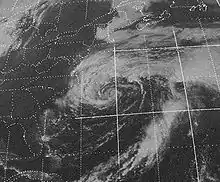 Now a tropical depression, Gilda remained nearly stationary for another 24 hours before accelerating northeastward,[3] under the influence of an upper-level trough exiting the east coast of the United States. Cold air from the trough interacted with Gilda, providing a baroclinic environment for intensifying, and on October 24 the storm transitioned into a subtropical storm about halfway between Hispaniola and North Carolina. This made Gilda the first tropical storm on record to transition into a subtropical cyclone. Operationally, tropical storm advisories were still issued on Gilda while it was subtropical, due to the need to maintain consistency and the possibility it could again become tropical. The circulation of the storm became very large, at one point stretching from New England to the Bahamas, and eastward beyond Bermuda, or a diameter of more than 1300 mi (2100 km). On October 25, Gilda passed about halfway between Bermuda and Cape Hatteras, when it reached peak winds of 70 mph (110 km/h). Subsequently, it turned northeastward, and on October 27 attained a minimum pressure of 984 mbar, the lowest of its duration while tropical or subtropical. Later that day, Gilda became an extratropical cyclone southeast of the Canadian Maritimes as it moved over colder waters. After passing just southeast of Newfoundland, the storm continued northeastward, becoming nearly stationary off the coast of Greenland before dissipating on October 30.[1]