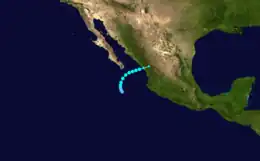 On September 22, a weak tropical disturbance was first observed southeast of Socorro Island. The disturbance moved northward uneventfully until late on September 23, when the disturbance became a tropical depression at a distance of 100 mi (160 km). The next day, the depression intensified into a tropical storm while moving north at 8 mph (13 km/h). Later on September 24, satellite imagery suggested winds of up to 50 mph (80 km/h) near the center. Around that time, Tropical Storm Hazel reached its peak pressure of 986 mbar (29.1 inHg). On September 26, a ship reported peak winds of 60 mph (97 km/h). The storm then moved towards the east-northeast and made landfall just south of Mazatlán on September 26 and transitioned into an extratropical cyclone shortly thereafter.[1][2]