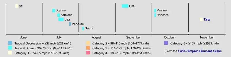 Tropical cyclone activity first began about a month after the official start of the season, with Iva developed on June 9. After Iva dissipated on June 11, there was another period of lack of tropical cyclogenesis for almost a month, ending after Tropical Storm Joanne developed on July 10. July was an active month, with four tropical cyclones developing. However, the month of August and September combined featured only two tropical cyclones. After September, there were two tropical cyclones in October, both existing only on October 3 and October 4. Two more tropical cyclones developed in November,[1] which was the first time on record, and would not occur again until 2006.[3]