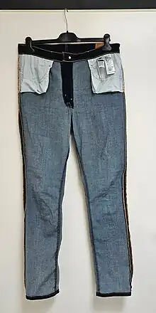 Trousers or pants (American English) are a staple of historical and modern fashion. Throughout history, the role of trousers is a constant change for women. The first appearance of trousers in recorded history is among nomadic steppe-people in Western Europe. Steppe people were a group of nomads of various different ethnic groups that lived in the Eurasian grasslands. Archaeological evidence suggests that men and women alike wore trousers in that cultural context.[1] However, for much of modern history, the use of trousers has been restricted to men. This norm was enforced in many regions due to social customs and laws. There are, however, many historical cases of women wearing trousers in defiance of these norms such as the 1850s women rights movement, comfort, freedom of movement, fashion, disguise (notably for runaway slaves[2]), attempts to evade the gender pay gap, and attempts to establish an empowered public identity for women.[3] Especially in the 20th and 21st centuries, the customs and laws restricting this manner of dress have relaxed dramatically, reflecting a growing acceptance and normalisation of the practice.[4]