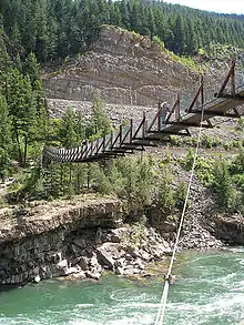 The nearby Kootenai Falls and the Swinging Bridge were featured in the 1994 movie The River Wild.[30] The original bridge was constructed by the Civilian Conservation Corps during the Great Depression, and the falls are a sacred site to the Kutenai tribes who originally lived in the area.[47]