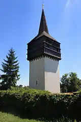 The Church of the Finding of the Holy Cross was first documented in 1350. It is originally a Gothic building, later baroquized. A bell tower from 1690 stands next to it separately. It is one of the most valuable fortificated church complexes in Bohemia.[3]