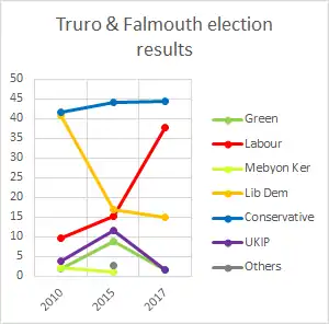 In the 2017 general election, the constituency was held by the Conservative candidate, although it experienced a 22.5% surge in the Labour vote (the third-largest in the UK), an 11.4% swing that nearly broke the Conservatives' seven-year hold on the seat. The 37.7% of the vote in the Truro and Falmouth constituency achieved by Labour marked their highest share of the vote in a seat incorporating Truro in 47 years (1970).[3]