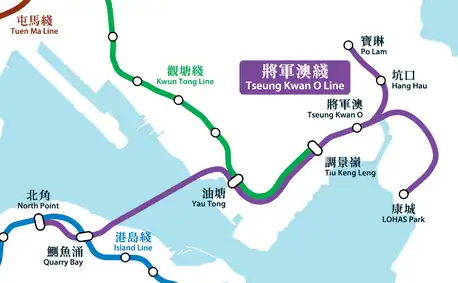 The Tseung Kwan O line (Chinese: 將軍澳綫) is one of the ten lines of the MTR system in Hong Kong, indicated by the colour purple. It is currently 12.3 kilometres (7.6 mi) long, taking 15 minutes to travel throughout the entire line.