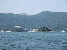 Distant view of Tso Wo Hang near the shore of Inner Port Shelter. The two islets are Tai Chau (left) and Lap Sap Chau (right).
