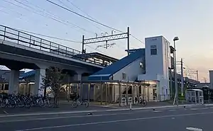 The station consists of two elevated side platforms serving two tracks.[1] The platforms are long enough to handle four-car trains.[1] The station is unstaffed.[2] A ticket vending machine, waiting room, and lifts to the platforms are located on the ground floor level.[1]