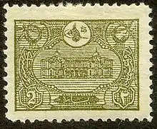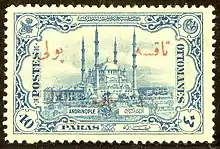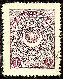 From 1901 through 1911, the Ottoman Empire issued a number of stamps with similar designs including the Tughra of the reigning monarch.[21] All early Ottoman stamps were printed in the Ottoman Empire, with the exception of the first two Duloz issues printed in Paris (see above). All these stamps also had a distinct Turkish appearance until 1913,[22] when a series of stamps was issued commemorating the recapture of Adrianople from the Bulgarians. These stamps were designed by Oskan Effendi and were engraved and printed in England by Bradbury, Wilkinson & Co., Ltd., and are in a more international style, with central vignettes surrounded by a frame. An example is illustrated in the lead to this article.[23]