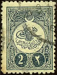 The postal cancellations, applied to Turkey's stamps to prevent re-use, carried the name, in Turkish—written in Arabic script—and sometimes also in the Latin alphabet, of the localities where posted. These cancellations have received extensive study by philatelists, who have cataloged several thousand used in the Ottoman Empire.[42] The cancellations include "negative seals," typically a circular stamp in which the Arabic lettering appears uninked against a black background.