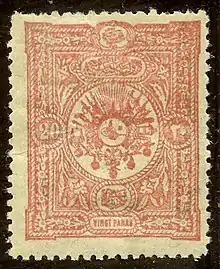 The design consists of the tughra, the emblem of sovereignty, for the then current ruler Sultan Abdülaziz, over a crescent bearing the inscription in Ottoman Turkish Devleti Aliye Osmaniye, or "The Sublime Ottoman Empire". Between some of the stamps there is a control band with the words Nazareti Maliye devleti aliye, or "Ministry of Finance of the Imperial Government".[4] The stamp was designed and lithographed at the Constantinople mint,[5] and the writing is entirely in Turkish using Arabic script. The issue includes four denominations issued as regular postage stamps, and the same four values as postage due stamps. Including paper variants, a total of 10 Scott catalogue numbers have been assigned the issue.[6]