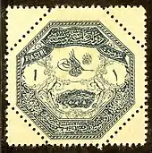 In 1863, the Ottoman Empire issued a set of postage due stamps,[34] being among the first countries in the world to issue stamps for that specific purpose. The postage dues through 1913 had the same designs as the regular stamps, such as the Duloz or Empire issues, but were typically distinguished by being printed in brown or black.[35] In 1914, the Ottoman Empire issued its first postage dues with their own designs.