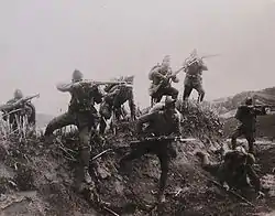 ![]() Clockwise from top left: Delegation gathered in Sivas Congress to determine the objectives of the Turkish National Movement; Turkish civilians carrying ammunition to the front; Kuva-yi Milliye infantry; Turkish horse cavalry in chase; Turkish Army's capture of Smyrna; troops in Ankara's Ulus Square preparing to leave for the front. | |||||||||