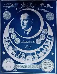 Hoping to undermine the Nationalist Movement, Mehmed VI issued a fatwa to qualify the Turkish revolutionaries as infidels, calling for the death of its leaders.[134] The fatwa stated that true believers should not go along with the Nationalist Movement as they committed apostasy. The mufti of Ankara Rifat Börekçi issued a simultaneous fatwa, declaring that the Caliphate was under the control of the Entente and the Ferid Pasha government.[135] In this text, the Nationalist Movement's goal was stated as freeing the sultanate and the caliphate from its enemies. In reaction to the desertion of several prominent figures to the Nationalist Movement, Ferid Pasha ordered Halide Edip, Ali Fuat and Mustafa Kemal to be sentenced to death in absentia for treason.[136]