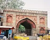 Sher Shah gate located to the south of Khairu’l-Manazil-Masjid is said to be an entrance to the large city of Delhi that Sher Shah built in front of his fortress of Purana Qila. The gate, mostly built with red sandstone but with use of local grey quartzite in its upper storey, is thus called the Lal Darwaza (red gate). Arcades were built from this gate into the city, which were provided with series of dwellings with frontage of a verandah, which may have been used for commercial establishments. Kabuli or KhuniDarwaza (explained in the following section) is another gate on the fringes of Sher Shah's city. ASI has undertaken extensive conservation works of the gate and its surroundings at a cost of Rs 7.5 million (US$150,000).[9][23][24]