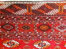 A Turkmen rug (Turkmen: Türkmen haly; or Turkmen carpet or Turkoman carpet) is a type of handmade floor-covering textile traditionally originating in Central Asia. It is useful to distinguish between the original Turkmen tribal rugs and the rugs produced in large numbers for export mainly in Pakistan and Iran today. The original Turkmen rugs were produced by the Turkmen tribes who are the main ethnic group in Turkmenistan and are also found in Afghanistan and Iran. They are used for various purposes, including tent rugs, door hangings and bags of various sizes.