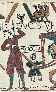The tapestry mentions a small number of important figures by name. When they are mentioned, their name is depicted directly above their head. For this reason, some believe that Turold is not the messenger in red who would later become Constable of Bayeux, but the man who appears to have a form of dwarfism and is holding the messenger's horse's reins.[1] It should also be noted that Turold was a common name at the time of the creation of the tapestry, and it is possible that both figures bear the name "Turold".