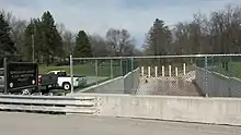 The Westinghouse Floodgate project was undertaken from 1937 to 1938 for the purpose of blocking similar floods from backing up into the Turtle Creek channel.[23] The project consisted of two adjoining floodgates, one 80 by 30 foot (24 m × 9 m) gate which could be lowered to block the creek itself, and an adjoining 40 by 20 foot (12 m × 6 m) gate that would be simultaneously block (Old) Braddock Avenue, which runs parallel to Turtle Creek in its floodplain.