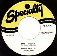Tutti Frutti (Italian for "all fruits") is a song written by Little Richard and Dorothy LaBostrie, recorded in 1955, which was his first major hit. With its energetic refrain, often transcribed as "A-wop-bop-a-loo-mop-a-lop-bam-boom!" (a verbal rendition of a drum pattern that Little Richard had imagined),[2] and its hard-driving sound and wild lyrics, it became not only a model for many future Little Richard songs, but also for rock and roll itself.[3] The song introduced several of rock music's most characteristic musical features, including its loud volume, powerful vocal style, and distinctive beat and rhythm.[4]