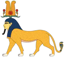 ![]() A depiction of Tutu as a lion with a human head, wearing the Double Feather crown, the Solar Disk and Ram Horns. | |