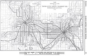 In 1890, the two cities were connected with a railway along University Avenue, the first of four rail lines linking them together.[1] A merger of the two city systems, the St. Paul City Railway Co. and Minneapolis Street Railway, formed the Twin City Rapid Transit Company. It went on a building spree, quickly doubling the amount of electrified track in the system.[2]