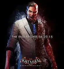 - Two-Face appears in Batman: Arkham Knight, in which he joins forces with Scarecrow and the eponymous Arkham Knight, among other supervillains, in an attempt to finally kill Batman. Using a selection of firearms supplied by the Penguin, Two-Face and his men oversee a string of bank heists in the side mission "Two-Faced Bandit", only to be defeated and sent to the GCPD lockup by Batman.[24] Additionally, Two-Face appears in the "Robin: A Flip of a Coin" DLC.[25]