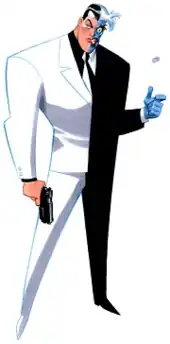 - First appearing in Batman: The Animated Series (1992), this version developed dissociative identity disorder as a result of years of repressed anger, which led to the creation of an alternate personality called "Big Bad Harv". After initially making minor appearances, with his most notable seeing him being brainwashed by Poison Ivy into dating her as part of an attempt on his life, Two-Face's self-titled two-part episode sees Dent's condition resurface amidst his engagement to Grace Lamont, his D.A. reelection campaign, and crime boss Rupert Thorne stealing his therapy records to use as blackmail material. The combined stress of these events causes "Big Bad Harv" to reemerge and attack Thorne. Batman attempts to intervene, but the fight triggers an explosion that severely scars the left side of Dent's face and body. Driven over the edge by his disfigured reflection, Dent reinvents himself as the gangster "Two-Face". In subsequent episodes, Two-Face becomes a crime boss in his own right, joins forces with other Gotham supervillains, and fights Batman several times.