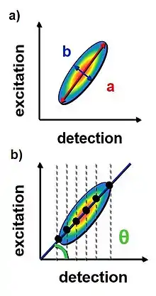 The temporal evolution of the lineshape can be evaluated with several methods. One method evaluates the linewidth along diagonal and off-diagonal line separately. From the two values of the widths it is possible to calculate the flattening as where is the linewidth along diagonal line and is the linewidth along off-diagonal line. The flattening curve as a function of assumes a value close to 1 at fs ( ) and then decreases to zero at fs (). Another method is called Central Line Slope (CLS).[10][11] In this case the positions of the maximum values in the 2D spectra per each detection frequency are considered. These points are then interpolated with a linear function where is possible to extract the slope between this function and the detection axis (x axis). From a theoretical point of view, this value should be 45° when is close to zero because the peak is elongated along the diagonal line. When the peak assumes a circular lineshape, the value of the slope goes to zero. The same approach can also be used by considering the positions of the maximum values per each excitation frequency (y axis) and the slope will be 45° at fs and 90° when the shape becomes circular.[12]