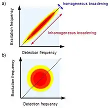 Thanks to the high spectral resolution, this technique acquires information based on the two dimensional shape of the peaks. When is close to zero the diagonal peaks show an elliptical lineshape as is shown in the figure on the right. The width along the diagonal line represents the inhomogeneous broadening which contains information about interactions between the environment and the system. If the system is composed of a large amount of identical molecules, each of them interacts with the environment in a different way; this implies that the same electronic state of each molecule assumes different small variations. The value of the linewidth will be close to the one calculated in the linear absorption spectrum. On the other hand, the linewidth along the off-diagonal shows a smaller value with respect to the diagonal one. In this case the spectral broadening contains a contribution from a local interaction inside of the system; for this reason, the width reflects the homogeneous broadening.[5]