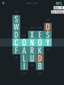 The game also includes "clue" stages in addition to the standard stages.[4] In a clue stage, the player is presented with clues (like a crossword puzzle) as well as the columns of letters. The player solves a clue by tapping on the clue and if they are correct, the clue will disappear.[5]