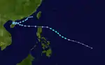 Typhoon Winnie—named Dading in the Philippines[45][15]—originated from a mid-Pacific trough, which organized into a cyclonic circulation on June 21 west-southwest of Pohnpei.[6]:86 This initial system moved towards the west-northwest, passing near Ulithi on June 25. The next day, the disturbance developed into a tropical depression and gradually took on a more westward course. Winnie reached tropical storm strength on June 27 and then typhoon strength on June 28 as it rapidly intensified en route to southern Luzon.[44][12]:74 The typhoon attained sustained winds of 165 km/h (103 mph) shortly before moving ashore Calabarzon on June 29;[44] its eye passed directly over Manila.[46] Winnie weakened as it moved over Luzon and restrengthened upon reaching the South China Sea, taking a west-northwesterly heading.[44][12]:74 There, Winnie reached its peak intensity with winds of 185 km/h (115 mph) and a central pressure of 945 hPa (mbar; 27.91 inHg). At 00:00 UTC on July 2, the typhoon made landfall on Hainan southwest of Wenchang with winds of 175 km/h (109 mph). Winnie weakened to a tropical storm and traversed Hainan and the Gulf of Tonkin before making a final landfall near Haiphong, Vietnam, on July 3. Further weakening ensued as the system tracked across northern Vietnam and southwest China before dissipating on July 4.[44]