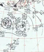 In May 1964, the western Pacific was characterized by anomalously high geopotential heights towards the northern part of the basin and low geopotential heights in the tropical regions. This configuration was favorable for tropical cyclogenesis and led to the development of typhoons Tess and Viola, the first storms of the 1964 typhoon season.[6][17] Shower activity in the tropics west of Hawaii was above average between May 10–20.[18] The first half of June marked a reversal of this pattern as a large area of low pressure became established over the mid-Pacific.[19] The average sea-level pressure for the month was below normal for most of the northern Pacific.[18] Typhoons Winnie and Alice formed in the second half of the month when the initial height patterns returned.[19] July 1964 featured more tropical cyclones than any other July on record, though this was superseded by the 1971 Pacific typhoon season.[20] A strong high pressure area south of Japan caused most storms during July to take slow and westward paths.[21]