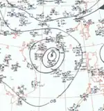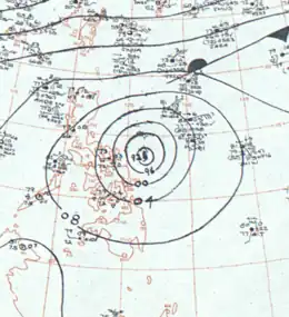 The disturbance that led to Typhoon Betty was first detected in the Philippine Sea on July 1 by the JTWC, having developed from a segment of a polar trough within an area of conducive winds in the upper-troposphere.[6]:96 The next day, the disturbance quickly developed into a tropical cyclone and strengthened into a typhoon by the end of July 2.[63] Reconnaissance aircraft observed an eye 75 km (47 mi) in diameter in Betty's first few hours as a typhoon.[6]:98 The storm's winds continued to increase, and on July 3 its winds reached 185 km/h (115 mph) before the rate of intensification stalled.[63] Betty took a northwestward trajectory towards the southern Ryukyu Islands,[12]:75 bringing its eye across southern portions of Miyakojima on July 4.[64] There, sustained winds reached 138 km/h (86 mph), punctuated by a maximum gust of 201 km/h (125 mph). The island also recorded 124 mm (4.9 in) of rain from Betty.[65]