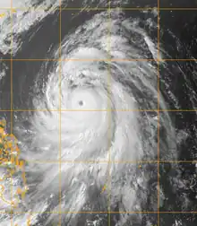 Rammasun continued to intensify and was designated as a severe tropical storm late on May 8.[10] The next day both the JMA and the JTWC reported that Rammasun had intensified into a typhoon.[11][12] Later that day the JTWC reported that the typhoon had rapidly intensified within the last six hours and had become a Category 3 typhoon on the Saffir–Simpson hurricane wind scale.[13] At the same time the JMA were reporting that Rammasun had winds of 150 km/h (93 mph).[14] The typhoon then continued to intensify quickly with the JMA reporting that Rammasun had winds of 160 km/h (99 mph), the JTWC then reported that Rammasun had become a Category 4 typhoon with winds of 225 km/h (140 mph).[15][16] Later that day both the JMA and the JTWC reported that the typhoon had reached its peak winds. The JMA reported peak winds of 195 km/h (121 mph) whilst the JTWC reported that Rammasun had peak winds of 250 km/h (160 mph), making it a category 4 super typhoon.[17][18] Typhoon Rammasun's minimum pressure was officially estimated at 915 hPa which tied with Intense Tropical Cyclone Hondo as second strongest storm of 2008[18][19]