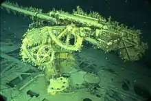 Oceanographer and National Geographic Explorer-in-Residence Robert Ballard explored and mapped the wreck in the summer of 2014 with remotely operated vehicles, where they noticed that the submarine's bow had been blown off and found rested on the seafloor 100 feet away from the main hull. They determined that the bow of the submarine was destroyed, apparently by a depth charge that landed on the forward deck, exploded, and caused an internal detonation of the submarine's own torpedoes, which broke off the bow. If so, this would be one of the few successful submarine kills caused by direct contact from a depth charge, as typical attacks relied upon depth charges exploding a short distance away to inflict repeated hydraulic shocks that would eventually crack a submarine's pressure hull.[15][16]