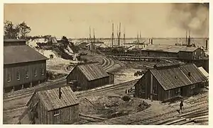 Grant established his headquarters on the grounds of Appomattox Manor overlooking the confluence of the Appomattox and James rivers. City Point, Virginia, modern day Hopewell, became the principal logistical base for the Virginia theater supplying the troops of both Meade's Army of the Potomac and Major General Benjamin Butler’s Army of the James. In all the United States Military Railroad supplied more than 100,000 troops and more than 65,000 horses and mules with food, equipment and supplies from the waterfront docks on the navigable portion of the James River at City Point.[32]