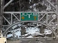 At the end of the bridge the AT leaves with NY 9D, which begins to follow the river north to Beacon and Wappingers Falls here. Routes 6 and 202 turn right to follow the NRHP-listed Bear Mountain Bridge Road.[4] The two wind around Anthony's Nose high above the river, with occasional views to Haverstraw Bay and the city of Peekskill to the south, and Dunderberg Mountain, Iona Island and the sections of US 9W the highway had just followed upriver.