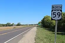 US-59 is a 210-mile-long (340 km) highway which runs from south to north in eastern Kansas. It enters the state from Oklahoma south of Chetopa and passes through Parsons, Ottawa, Oswego, Moran, Garnett, and Lawrence. The route leaves Kansas for Missouri by crossing the Missouri River at Atchison. Most of the route climbs the cuestas of the Osage prairie,[2] while north of the Kansas River, it cuts through the glaciated region.[3]