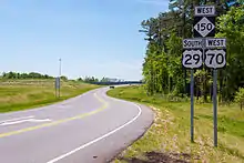 At 1.16 miles (1.87 km) from the Yadkin River, NC 150 splits towards Churchland while US 29/US 70 merges with I-85/US 52 (at exit 84). After a 4.31-mile (6.94 km) concurrency, I-85 splits off and continues towards Greensboro, and I-285 begins (at exit 87). Entering the Lexington city limits, additional route changes occur; I-285/US 52 departs (at exit 87) towards Winston-Salem, and US 64 merges from Mocksville. After skirting north of downtown Lexington, US 64 departs again towards Asheboro, and the highway continues northeasterly as a four-lane expressway. After passing through Thomasville, it then proceeds briefly through Randolph County and then into High Point and Guilford County. Staying south of the downtown area, it connects with I-74 with its second three-level diamond interchange. Near Groometown, the highway merges with I-85 for a brief 1-mile (1.6 km) concurrency (between exits 118 and 120A). To connect with I-73/US 421 (Greensboro Urban Loop), travelers must continue on I-85 or stay in the left travel lanes; this stretch of freeway features numerous sign gantries and surface markings to guide travelers. Continuing northeasterly along Preddy Boulevard into Greensboro, it connects with South US 220 (at exit 35), where travelers can connect to Interstate 85, or go northbound to reach I-40 west or the Greensboro Coliseum.[6] Merging onto I-40/US 220/US 29 (at exit 219), the following 2-mile (3.2 km) stretch of freeway is known locally as "Death Valley", a nickname given because of the high number of deaths due to car crashes in this area, owed to having five routes attached to it.[14] Separating from I-40/I-85 Bus. at the O'Henry Boulevard interchange (at exit 223), US 29/US 70/US 220 continue north, passing by the North Carolina A&T campus to the Wendover Avenue interchange, where the 3 routes break up. With US 29 continuing north along the expressway towards Reidsville and Danville, Virginia, and US 220 North going west on Wendover Avenue to follow Battleground Road to Summerfield, US 70 again proceeds solo, east on Wendover Ave towards Burlington. At the eastern edge of Greensboro's city limit, US 70 connects with I-785/I-840 (Greensboro Urban Loop). Leaving Greensboro and entering McLeansville, US 70 takes on the name "Burlington Road" as well as the Charlotte Hawkins Brown Memorial Highway. Here it is a two lane road, and is also an important route that connects McLeansville with other small towns such as Sedalia and Gibsonville, as well as the Rock Creek and Stoney Creek centers in Whitsett; east of Whitsett, it enters Alamance County.[6][15][16][17]