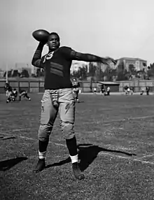 William H. Spaulding came to UCLA from Minnesota in 1925. As the Bruins head coach, his overall record in 14 seasons was 72–51–8.[7] During his tenure in Los Angeles, Spaulding led the Bruins to their first bowl appearance and victory, the 1938 Poi Bowl.[7] Also during Spaulding's tenure, the Bruins left the SCIAC and joined the Pacific Coast Conference beginning in 1928.[8] Spaulding's 72 wins rank him among the best in head coaching victories in Bruin football history.[9] He retired after a successful fourteen-season tenure ended after the 1938 season.[10] Edwin C. Horrell was promoted to head coach following Spaulding's retirement.[11] His 1942 UCLA Bruins team lost to Georgia in the 1943 Rose Bowl.[12] He was the first coach to lead a UCLA team to defeat rival USC.[11] It was the first football victory in the UCLA–USC rivalry. The most notable player who played for Horrell at UCLA was Jackie Robinson, who went on to a Hall of Fame career in professional baseball.[11] Horrell's 1939 team compiled a 6–0–4 and his 1941 team posted a 5–5–1 record.[12] With the exception of the 1942 season, the combined record of the Bruins during Horrell's tenure outside the aforementioned seasons was 6–22–1.[12] These struggles led to Horrell's firing after six seasons at the helm of UCLA football.[11] coach Bert LaBrucherie was hired by his alma mater to replace Horrell.[11] LaBrucherie's overall record at UCLA was 23–16.[13] In his second year as head coach, the Bruins were Pacific Coast Conference champions, but lost to Illinois in the 1947 Rose Bowl.[14] LaBrucherie's Bruins only posted one losing season during his four seasons, a 3–7 1948 season in what turned out to be his final season.[13] LaBrucherie accepted the position of head football coach at California Institute of Technology after the 1948 season, departing UCLA.[11]