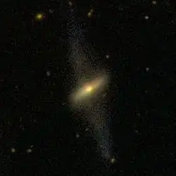 UGC 9796 is a lenticular and polar-ring galaxy in the constellation Boötes, and about 250 million light years distant from Earth. It is an object of great scientific interest as there have been very few polar ring galaxies discovered. UGC 9796 is a very gas-rich environment hosting as much 5×109 solar masses of neutral hydrogen.[4] DSS and SDSS images show that it is very similar to polar ring galaxy NGC 660, the best-known of all the polar ring galaxies.