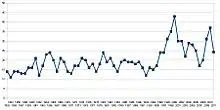 In the 1970s, the required number of sales needed to top the chart was roughly 150,000.[2] During 1992, when few releases were reaching number one, sales of CD singles were low: songs needed to sell only 60–70,000 each week to remain at the top.[3] In 2000, when turnover of number ones was high, tracks could often sell between 100,000 and 200,000 copies in a single week.[3] UK chart commentator James Masterton remarked in 2003: "When record sales are high, public interest in a song expires very quickly and this creates a need for ever more new product to take its place."[3] Sales figures improved in 2008 and continued into the early 2010s, peaking in 2013, before declining over the next few years as audio streaming became popular. Eventually, streaming was incorporated into the sales chart.