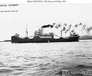 ![]() USS Aries (AK-51) Off the Mare Island Navy Yard, California, on 29 May 1944. She is carrying the main armament of two 3"/50 guns, one forward and one aft, that was fitted when she was manned by a Navy crew and commissioned in July 1942. | |