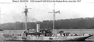 USS Carola IV, was a patrol ship of the United States Navy, built in 1885 by Culzean Shipbuilding & Engineering Company, Maidens, South Ayrshire, Scotland, as the steam yacht Black Pearl. She was built for the Earl of Pembroke & Montgomery. In 1895 the yacht was sold to E B Sheldon of Chicago, Illinois, USA.[1] and in 1900 she was purchased by Evans R Dick of Philadelphia, Pennsylvania and renamed Elsa.[2][3] She was later briefly named Haida and Columbine, but by mid-1910 was owned by Leonard Richards of New York City, Commodore of the Larchmont Yacht Club.[1][4]