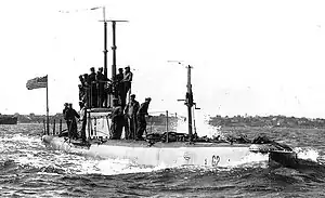 USS G-2 (SS-27) was a G-class submarine of the United States Navy. While the four G-boats were nominally all of a class, they differed enough in significant details that they are sometimes considered to be four unique boats, each in a class by herself. G-2 was named Tuna when her keel was laid down on 20 October 1909 by the Lake Torpedo Boat Company in Bridgeport, Connecticut, making her the first ship of the United States Navy to be named for the tuna, a large, vigorous, spiny-finned fish highly esteemed for sport and food. She was renamed G-2 on 17 November 1911, launched on 10 January 1912 sponsored by Ms. Marjorie F. Miller, towed to the New York Navy Yard after the termination of the Lake contract on 7 November 1913 where she was completed, and commissioned on 1 December 1913.