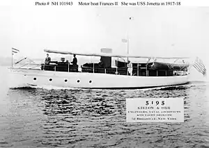 ![]() Jimetta as the private motorboat Frances II sometime between 1915 and 1917. | |